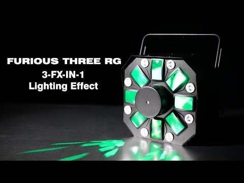The Eliminator Lighting Furious Three RG is a 3-FX-IN-1 lighting effect - utilizes three light sources – six 5W 5-penta LEDs, eight 3W quad LEDs and a red and green laser – to give users a Moonflower/Wash/Laser combo effects that create a high level of enjoyment for party guests.