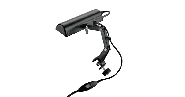 Classic music stand light with black light shade. Three-way tilt adjustment for precise placement. Two meter electrical cable with on-off switch and Euro-style plug. One tubular bulb included. Uses only tubular bulbs with a maximum rating of 25 watts. In-door use only.
