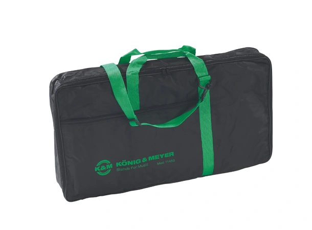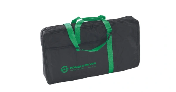Vanntett nylon bæreveske for K&M orkester notestativer, passer til 118/1 og lignende modeller. Veskene har 2 interne rom og en utvendig lomme for noter og tilbehør. Praktisk helårs glidelås, sterke nylonhåndtak og en avtagbar, justerbar skulderrem. Farge: svart med silketrykket K&M-logo.
