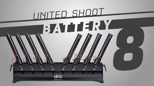 United Shoot Battery 8 er et åtterørs avfyringssystem for elektriske konfetti- eller strimler som kan avfyres individuelt eller samtidig. Den er utstyrt med to strømforsyninger som gjør det mulig å utløse effekten i serier på fire. Avfyringen utløses av en 220V/50Hz elektrisk impuls. Du kan kontrollere enheten din med DMX-512 eller i standardversjonen ved hjelp av PowerCon strømforsyning.