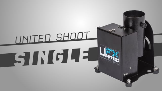 United Shoot Single er et system for enkeltrør som skyter elektriske konfetti- eller strimler. Avfyringen utløses av en 220V/50Hz elektrisk impuls, og pistolen kan roteres 180°. Du kan kontrollere enheten din med DMX-512 eller med standardversjonen med PowerCon.
